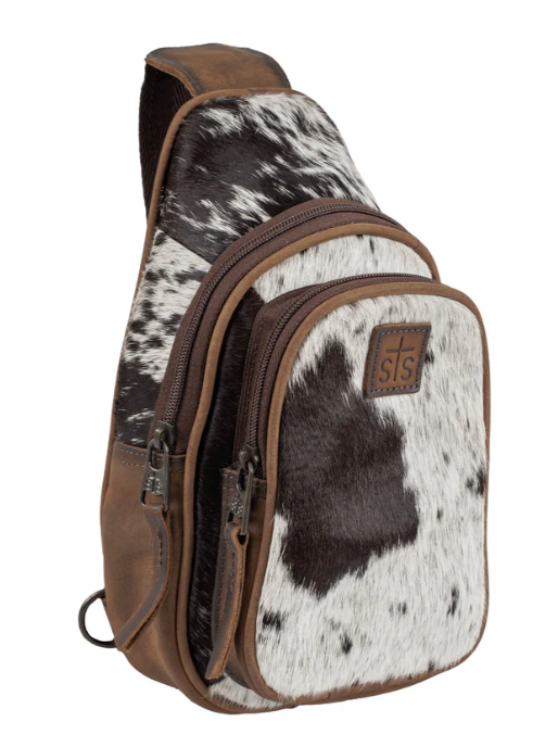 Add a touch of western flair to your getup with the Cowhide Sojourner Sling that is made from hand selected hair on hide with genuine full grain leather.