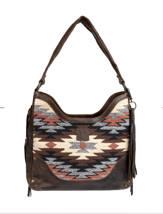 he Guadalupe Serape Hobo Bag captures the essence of fall with its rich palette of browns, creams, grays and black colors and is crafted from hand-woven cotton with full grain leather accents for a timeless rustic charm.