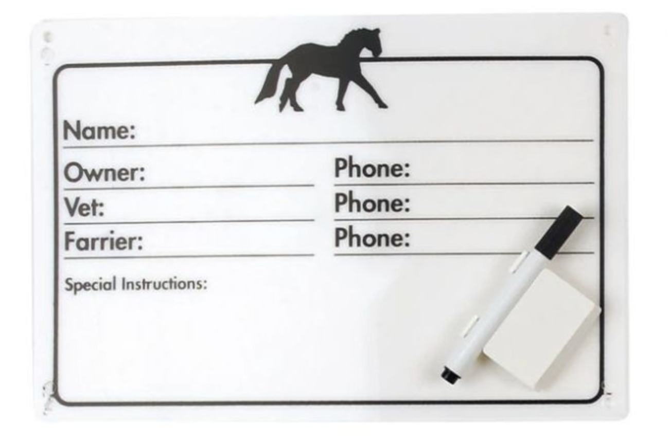 Plaque displays horse's name, owner, vet, farrier, corresponding contact numbers, and special instructions. A must for boarders and boarding stables!