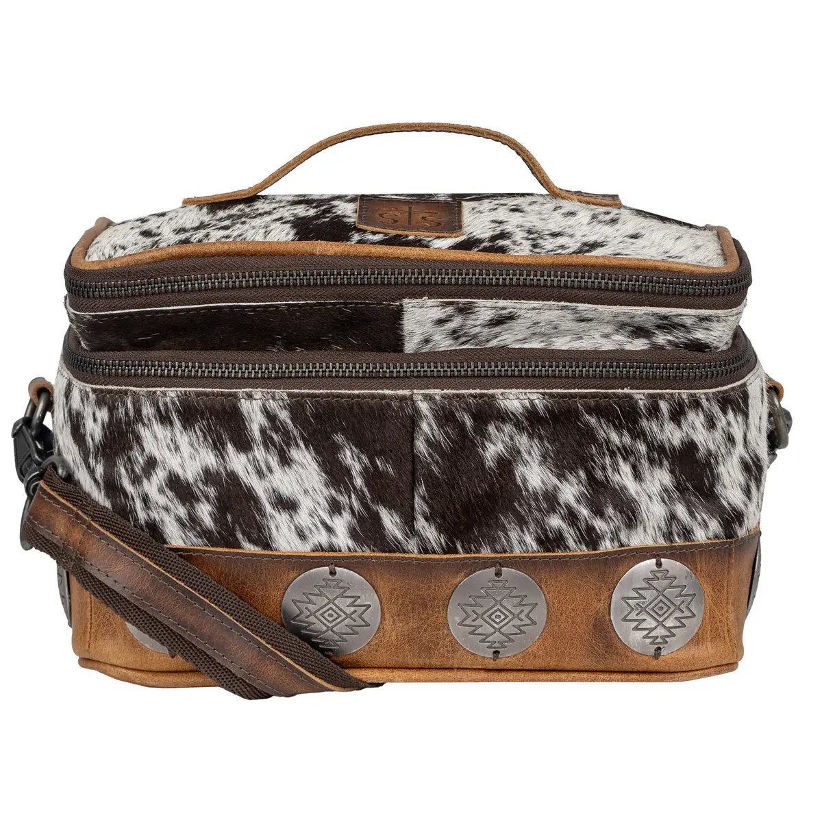 The Vaquero Collection features large rustic conchos reimagined with unique cowhide designs. Each piece is meticulously finished and embodied with a saddle tan and distressed full grain buckskin leather.